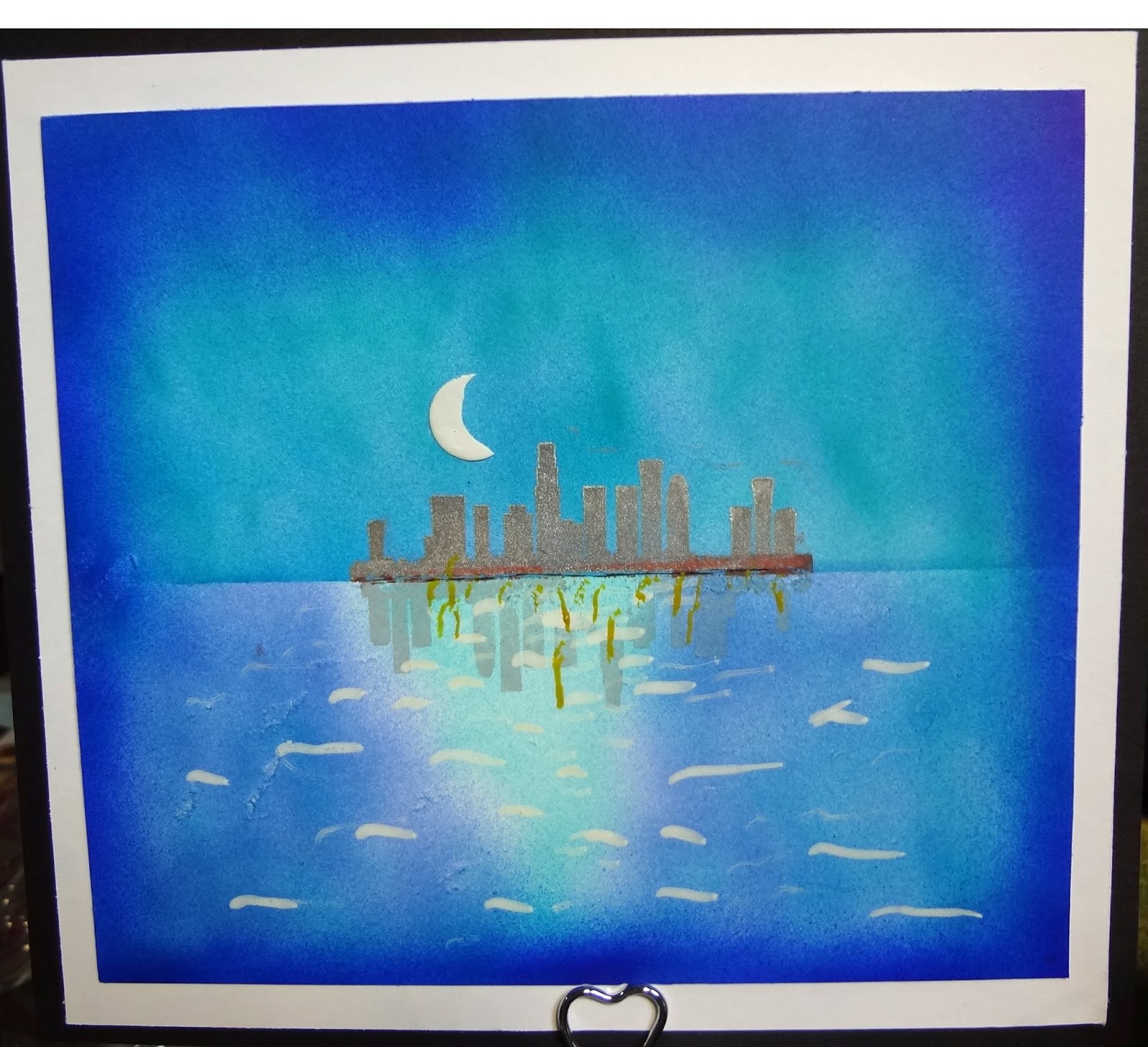 When I removed my tape I was able to cover the top portion of my skyline , turn upside down and mirror image the stamp image for the water reflection. I added wave like marks with a paint pen as well as draw the moon. I also added some yellow watercolor paint on top for a city glow on the water.